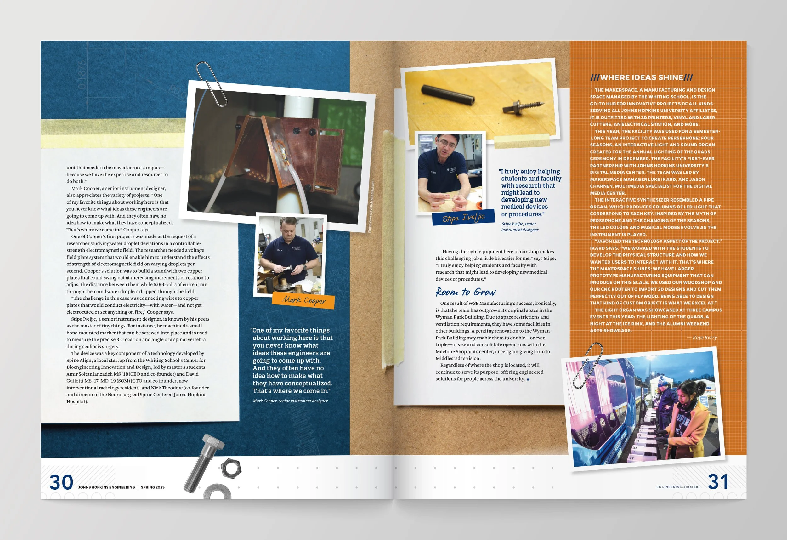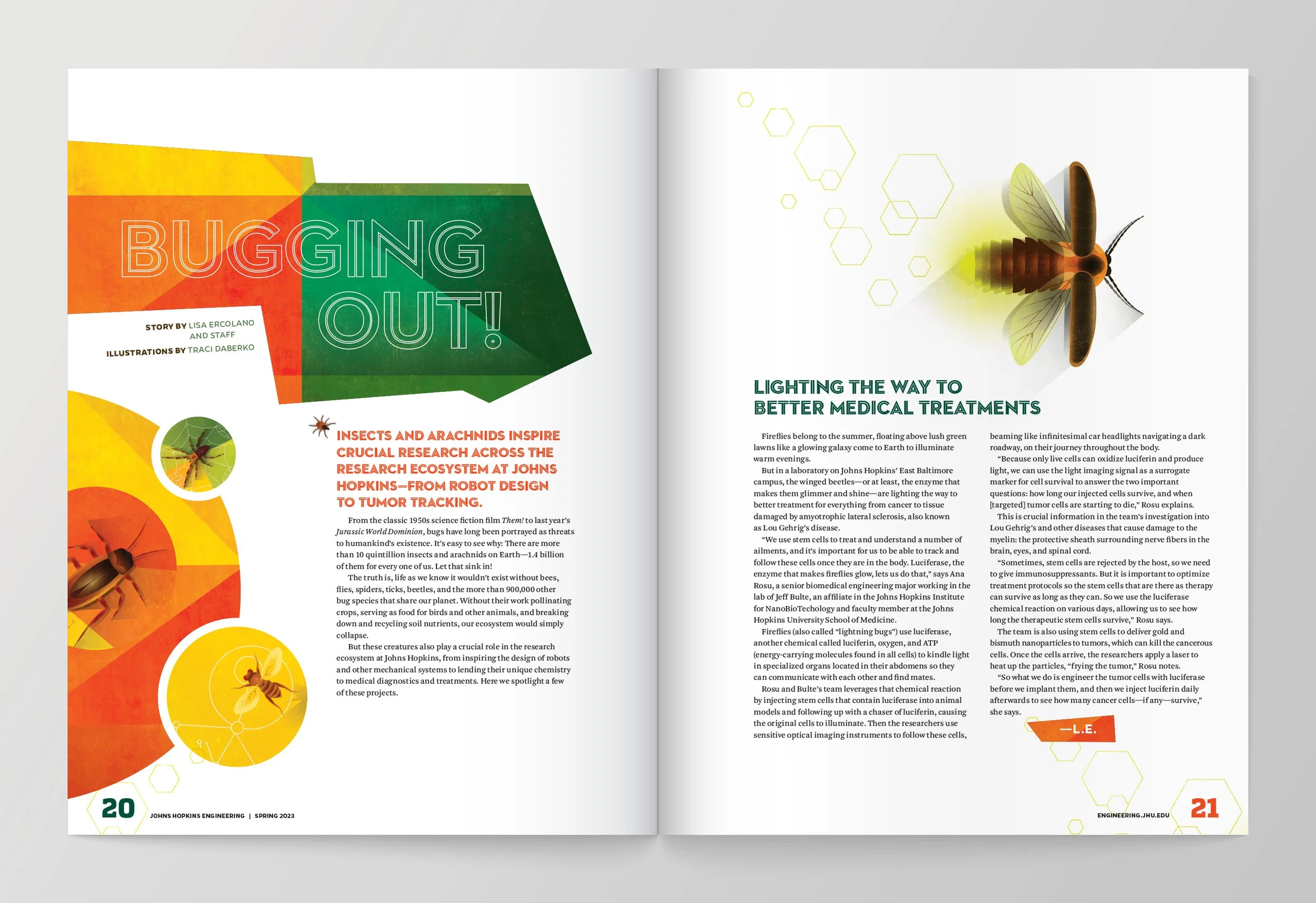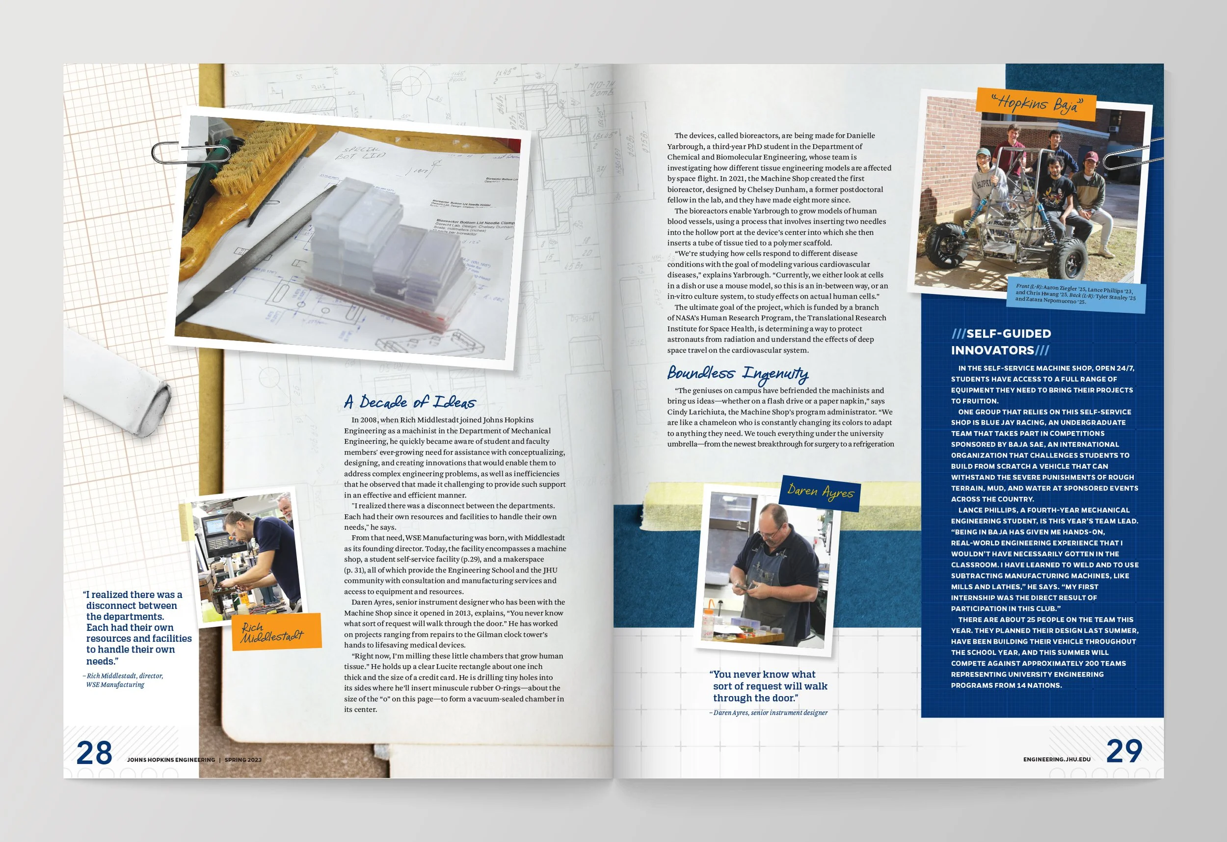 Cut Once supports the ongoing editorial design and art direction needs for JHU Engineering. This includes strategic planning, department and feature story ideation, art budget negotiation and management, illustration and photography development, technical design layout, printing/production management, online asset preparation, and vendor sourcing and management.