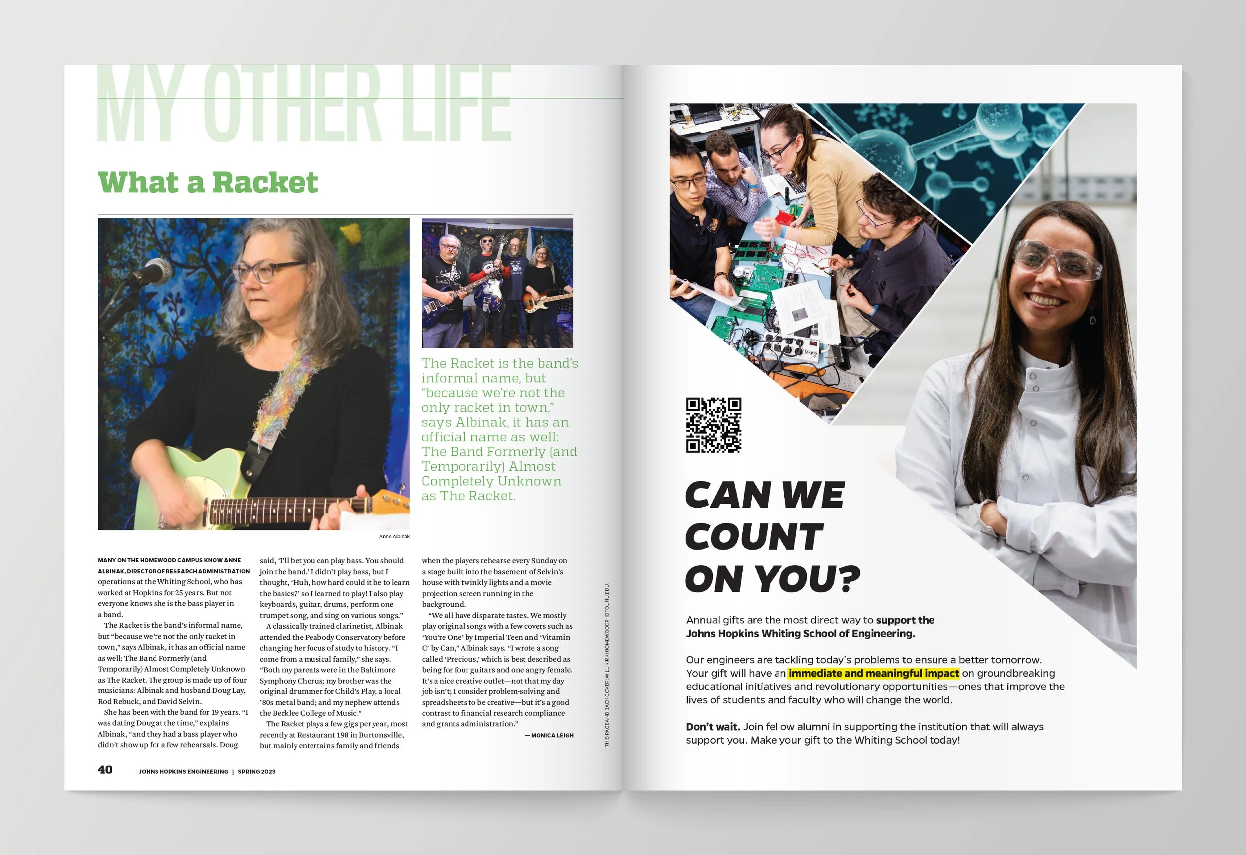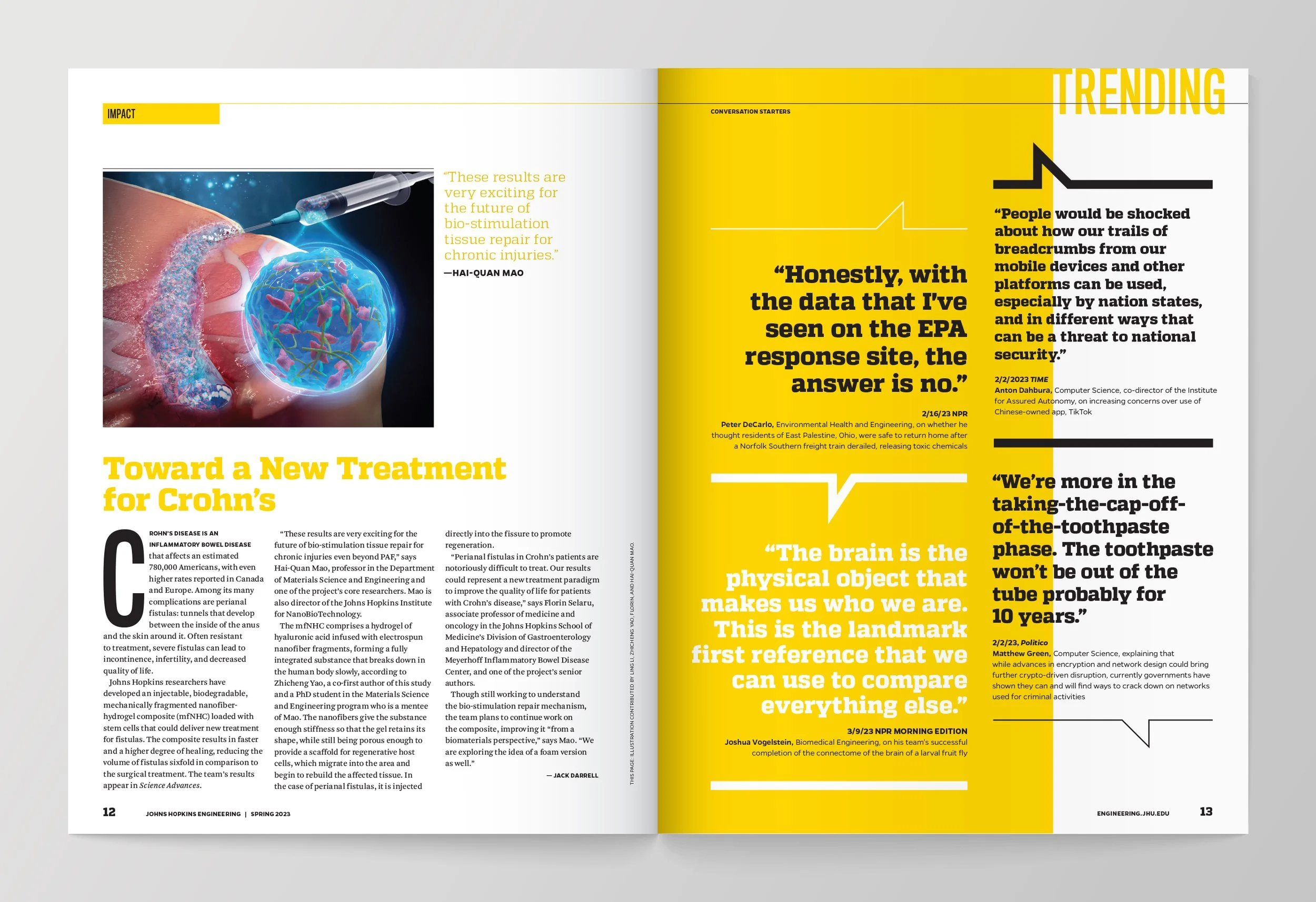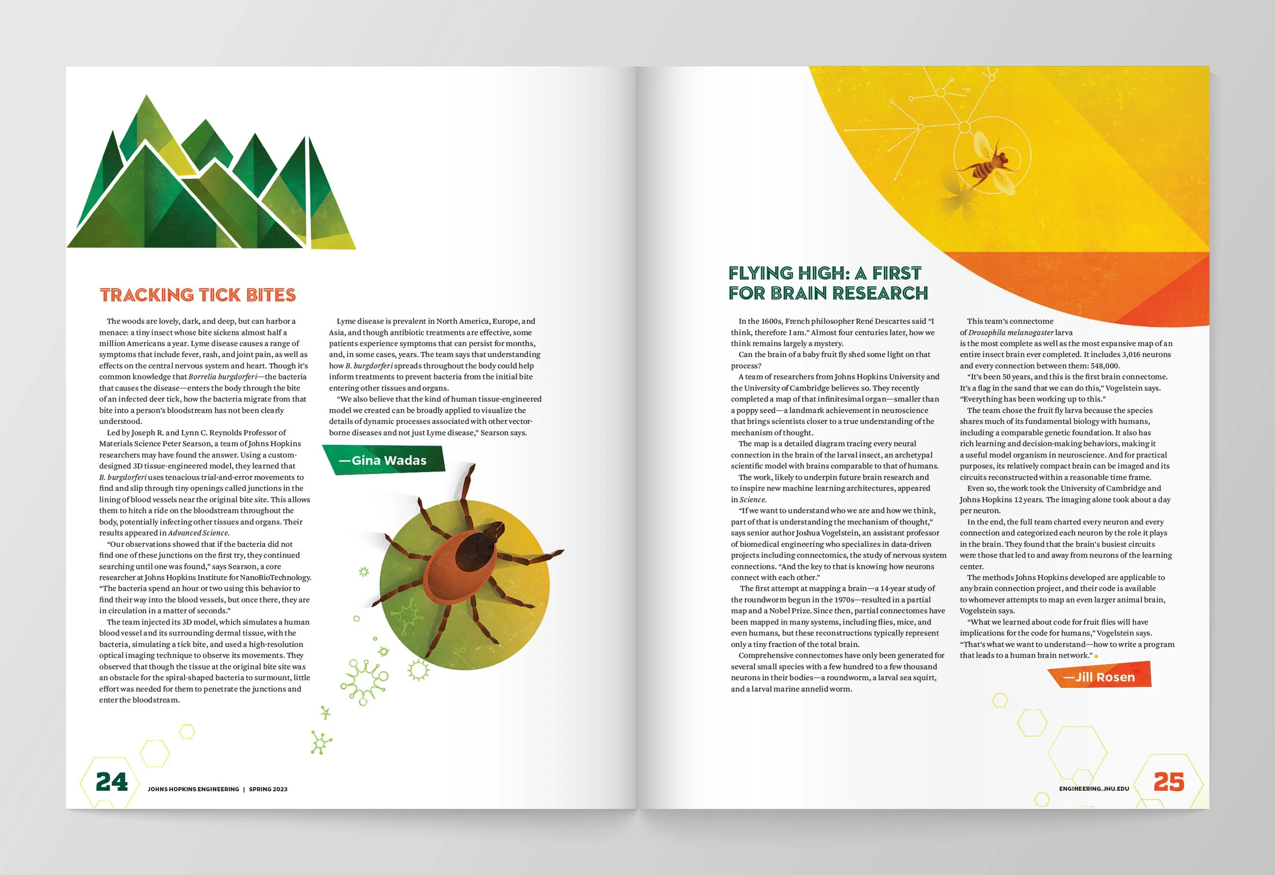 Cut Once supports the ongoing editorial design and art direction needs for JHU Engineering. This includes strategic planning, department and feature story ideation, art budget negotiation and management, illustration and photography development, technical design layout, printing/production management, online asset preparation, and vendor sourcing and management.